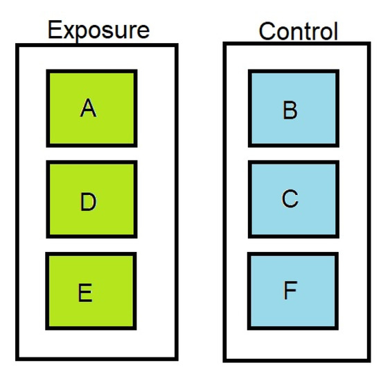 Schematic illustration of exposure and control tanks showing three sub-compartments for each exposure regime, based on [26]. A, D and E contained mussels exposed to cyanobacteria, whilst B, C and F were control tanks with no toxin containing cyanobacteria exposure.