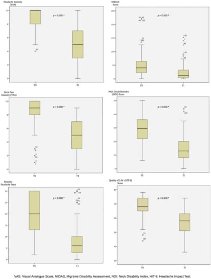 Age, Body Mass Index, migraine-diagnosed years and neck pain duration (months) were recorded for all patients. The primary outcome measures were the Neck Disability Index (NDI), the Migraine Disability Assessment (MIDAS), headache and neck pain intensity and the number of monthly headache days. The secondary outcome measure was the Headache Impact Test (HIT-6). The primary and secondary outcomes were evaluated at baseline and three months after ONA treatment.