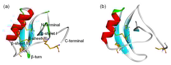 3D structure of β-ScTxs. (a) The crystal structure of a toxin from the scorpion Centruroides noxius Hoffmann (2YC1); (b) The structure model of AGAP. Residues forming four disulfide bonds are orange; α-helices and β-sheets are colored red and blue, respectively. Naming notations of secondary structures are labeled in (a).
