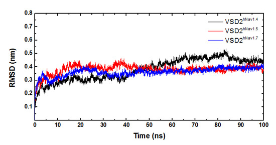 RMSD curves of systems of VSD2s on hNav1.4, hNav1.5, and hNav1.7.