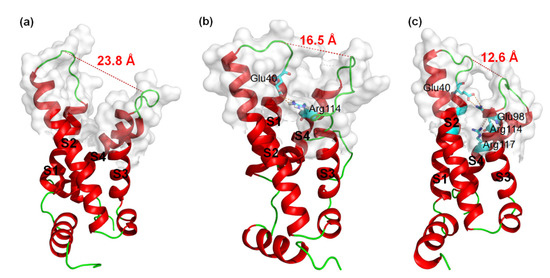 3D structures of VSD2s on hNav1.4, hNav1.5, and hNav1.7. (a) VSD2hNav1.4; (b) VSD2hNav1.5; (c) VSD2hNav1.7. Dashed lines in orange indicate salt bridges; in red are widths of the active pockets formed by loops between DII S1–2 and DII S3–4; amino acid residues formed by salt bridges are in sticks.