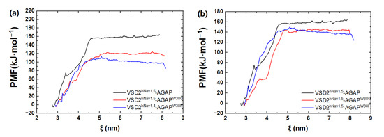 Based on the SMD method, the specific modes and interactions of critical residues are depicted precisely by analyzing the dissociation of the peptides from the three VGSC isoforms. The results show that AGAP, AGAPW38G, and AGAPW38F are separated completely from VSD2hNav1.4 after 3680 ps, 2950 ps, and 3360 ps (Figure 8a), as is VSD2hNav1.5 after 2880 ps, 2920 ps, and 3070 ps (Figure 8b). PMF indicates that the binding free energy of AGAP, AGAPW38G, and AGAPW38F are 190.64 kJ·mol−1, 175.68 kJ·mol−1, and 150.53 kJ·mol−1 to hNav1.4 (Figure 9a), as well as 164.81 kJ·mol−1, 146.19 kJ·mol−1, and 149.48 kJ·mol−1 to hNav1.5 (Figure 9b). Apparently, WT has a higher affinity for hNav1.4 and hNav1.5 than the two mutants. Moreover, the same change trend is expressed between dissociation time and binding affinity. Overall, the simulation and previous patch clamp experimental results are consistent with each other. Furthermore, the proportion of electrostatic and VDW interactions in AGAP binding with hNav1.5 were found not as regular as it was with hNav1.4 and hNav1.7, which were dominated by only one single type of interaction (see Section 2.3.2 and Section 2.3.3 for details).