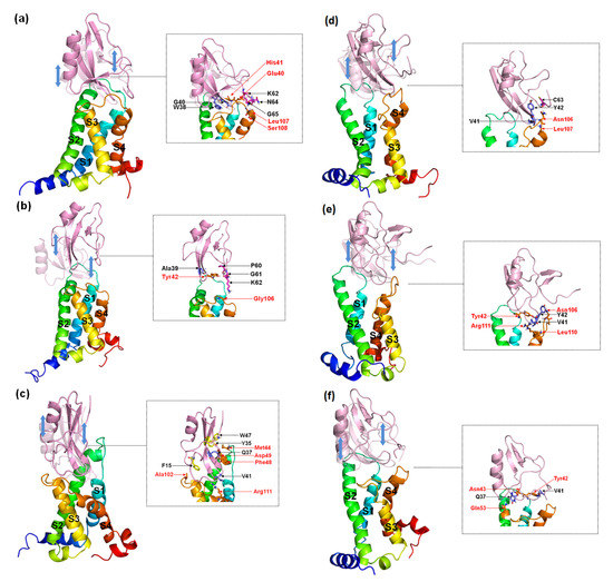 Six residues in the β-turn (W38, A39, V41, Y42, G43 and N44) participate in the combination of AGAP with VSD2hNav1.4 (Figure 6a). Among these residues, W38, A39, V41, and N44 are well positioned to interact with the bond DII/S1-S2 loop, and V41, Y42, and G43 interact with the DII/S3–S4 loop. Moreover, W38 and V41 have wide ranges of interactions with VSD2hNav1.4. Specifically, W38 contacts Met37/His41/Pro43/Leu52 in the DII/S1–S2 loop, while V41 contacts Met39/Thr53 in the DII/S1–S2 loop and Arg111/Arg114 in the DII/S3-S4 loop. Additionally, K62, C63, N64, and G65 in the AGAP C-terminal are also active in binding with VSD2hNav1.4. They interact with Leu107/Ser108 in DII/S3–S4 except for K62, which interacts with Glu40 in the DII/S1–S2 loop. Apart from residues in these two regions, Y5, Y14, F15, and Y35 in wild type (WT) contributed to the bindings as well.