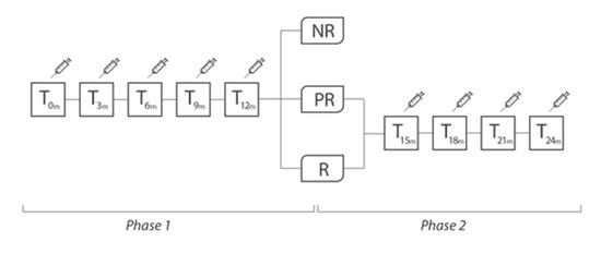 All included patients were treated with onaBT-A according to Phase III REsearch Evaluating Migraine Prophylaxis Therapy (PREEMPT) paradigm [9,10]. Administration of up to additional 40 UI was allowed, in line with the PREEMPT “follow the pain” paradigm, at the injector’s discretion and according to individual patients’ needs. Patients were treated with onaBT-A every 3 months for 5 cycles (Phase 1 of the study, 1 year of therapy). Then, at the beginning of the Phase 2 of the study, patients were divided into “responders” (R, patients with reduction in the number of headache days per month ≥50%), “partially responders” (PR, patients with reduction in the number of days of headache per month <50%, but ≥25%), “non-responders” (NR, patients with reduction in the number of headache days per month <25%). This subdivision was possible on the basis of clinical data recorded on headache diaries. Due to headache frequency and intake of symptomatic drugs data, after 5 onaBT-A cycles, it was possible to detect the proportion of patients who still have MOH. At the beginning of Phase 2, onaBT-A treatment was suspended for NR patients, redirecting them to other prophylaxis treatments. We proposed to R and PR patients to continue with an additional 12 months of treatment (additional 4 sessions, 1 every 3 months). R and PR patients, at the end of the Phase 2, underwent clinical follow-up visits to assess whether the efficacy of the drug, partial or complete, was sustained over time (see Figure 1 and Table 1).