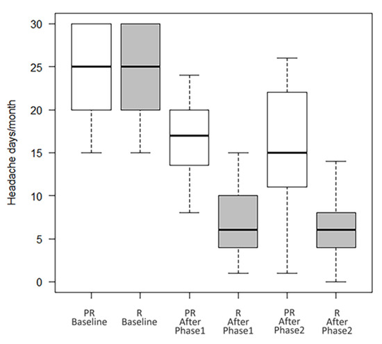 Number of headache days/month of R and PR patients at baseline, after Phase 1 and Phase 2.