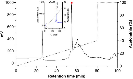 Purification of the synthetic Cm39. After re-folding, sCm39 was purified using C18 preparative column (238TP1022 Vydac) with a linear gradient of solution A (0.12% TFA in water) to 40% solution B (0.1% TFA in acetonitrile) over 80 min (black dashed line) and at a flow rate of 5mL/min. Inset shows the re-purification of the main fraction (RT 54.8, indicated with red asterisk) in a C18 analytical column (218TP54 Vydac) with a linear gradient from 0 to 60% B solution in 60 min (black dashed line).