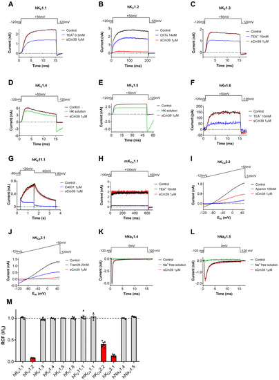The primary sequence of Cm39 has a significant resemblance with several scorpion toxins that are highly potent inhibitors of voltage-gated K+ channels. We, therefore, aimed at testing the pharmacological activity of sCm39 on a battery of various potassium and sodium ion channels. Among the tested channels were six members of human voltage-gated K+ (hKV) channels from Shaker family, hKV1.1-hKV1.6 (Figure 3A–F) and three members of Ca2+-activated potassium channel; hKCa2.2 (SK2, Figure 3I), the small-conductance Ca2+-activated channel; hKCa3.1 (IKCa1, SK4. Figure 3J), the intermediate-conductance Ca2+-activated channel expressed in T lymphocytes; and mKCa1.1 (BK, Slo1, MaxiK, Figure 3H), the large-conductance voltage- and Ca2+-activated channel of mice. In addition, we also screened the effect of Cm39 on hKV11.1 (hERG1, Figure 3G), a voltage-gated cardiac K+ channel, and two human voltage-gated sodium (hNaV) channels, hNaV1.4 (Figure 3K) and hNaV1.5 (Figure 3L), expressed in skeletal and cardiac muscles, respectively. These ion channels were heterologously expressed in the CHO or HEK cell lines except for KV1.3. Human peripheral T lymphocytes. They were stimulated with Phytohemagglutinin A (PHA) to increase the KV1.3 channel expression, and Ca2+-free intracellular solution was used to avoid KCa3.1 channel activation [30]. Appropriate depolarization protocols were used to record ionic currents in voltage-clamped cells (see Figure 3 insets and Material and Methods for details). Freshly dissolved sCm39 in extracellular solution was applied at 1 µM concentration on the cell using a custom-built micro-perfusion system at ~200 µL/min flow rate. The complete exchange of solution in the recording chamber was ensured by frequently using either fully reversible blockers, such as TEA+ for KV1.1, KV1.3, KV1.6 and mKCa1.1; Charybdotoxin (ChTx) for KV1.2; and apamin for KCa2.2 or specific solutions that allow testing the solution exchange: HK-150 solution for KV1.4 and KV1.5; and Na+-free solution for NaV1.4 and NaV1.5 as positive controls. The decrease in the current upon perfusion of the cell with these controls confirmed the nature of ion channel expressed, especially when specific inhibitors were used, and that full solution exchange was achieved.