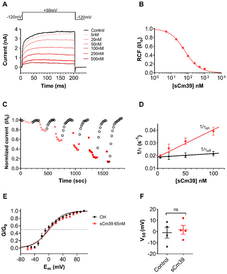 For comprehensive characterization of Cm39 activity on KV1.2, we determined the concentration–response of current inhibition by Cm39, the kinetic parameters of its binding and assessed the effect on voltage dependence of steady-state activation. The whole-cell KV1.2 currents were recorded in CHO cells using depolarization pulses to +50mV from −120mV holding potential (Vh) every 15 s. Since the activation kinetics of KV1.2 are highly variable [32], the duration of pulses was set on a cell-by-cell basis between 15–300 ms to allocate sufficient time for reaching maximum currents at the test potentials. Figure 4A shows KV1.2 current traces recorded sequentially in the same cell in the absence of toxin (control trace) and after perfusing the cell with different concentrations of sCm39 until the equilibrium block. sCm39 reduces the KV1.2 currents in a concentration-dependent manner, i.e., 5, 20, 50, 100, 250 and 500 nM inhibited approximately 5, 22, 43, 62, 78 and 87% of current at equilibrium block. The remaining current fractions (RCF = I/I0, where I0 is the peak current in the absence of the toxin, and I is the peak current at equilibrium block in the presence of sCm39 at a given concentration) were calculated and plotted as a function of toxin concentration. The Hill equation was fit to the data points of the concentration–response relationship (see Materials and Methods), which resulted in a dissociation constant (Kd) of 65 nM with a Hill coefficient of 0.96 (Figure 4B).