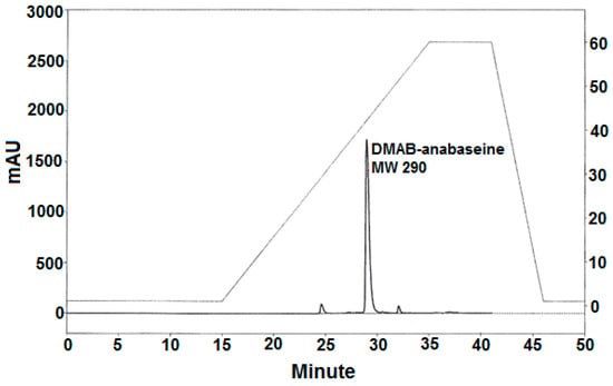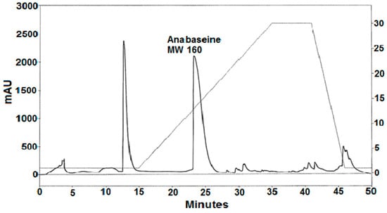 If they were present, two other known hoplonemertean alkaloids (2,3′-bipyridyl [] and 3-methyl-2,3′-bipyridyl []), being less basic and polar, would have eluted earlier than anabaseine, and three other more polar nemertean alkaloids (isoanatabine [], anabasine [] and nemertelline []) would have eluted after anabaseine. However, re-HPLC of the 13 min and post-15 min peak components shown in Figure 4 failed to reveal these compounds. Smaller amounts of other pyridyl compounds might be found in future studies when more worms become available.