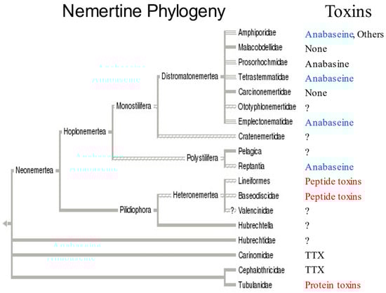 Known occurrence of toxins in nemertean taxa, based on a proposed phylogenetic tree (adapted from []). Major families (Amphiporidae, etc.) are listed on the right side of the tree. Currently known nemertean toxins or types of toxins are listed next to the families in which they have been found. Blue color indicates presence of anabaseine; Red color indicates peptide toxins have been found in the two other major taxa. Pilidiophora were previously called Heteronemertea and the complex comprising Hubrechtidae, Carinomidae, Cephalothricidae and Tubulanidae were called Paleonemertea. One species (Amphiporus angulatus) belonging to family Amphiporidae is known to have >15 pyridine alkaloids [Kem et al., in preparation]. TTX has been found in certain species [,,].
