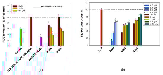 Previously, we proved that the studied substances are able to inhibit the production of ROS in neuronal cells under the action of high concentrations of ATP [18]. In the present study, the ability of compounds U-286 and U-548 to inhibit ROS production in RAW 264.7 macrophage cells under the action of low concentrations of ATP (300 µM) with pre-priming of cells with LPS (100 ng) was studied (Figure 5a). This ATP/LPS effect on macrophages showed an increase in ROS production by 40.2%. At the same time, treatment with only LPS or only ATP did not show a significant increase in ROS production, which may indicate the synergistic participation of these two compounds in the induction of inflammation and oxidative stress. The inhibitory effect of the studied compounds was evaluated in comparison with the action of the standard P2X7 receptor blocker A438079 at a concentration of 10 µM, significantly decreasing intracellular ROS amount by 69.7 ± 3.2% compare to ATP/LPS. As a result, it was shown that pretreatment of cells with U-286 and at concentrations of 5.0, 1.0, and 0.1 µM demonstrated a statistically significant reduction of the ROS level by 27.5 ± 9.5%, 36.2 ± 3.8%, and 61.8 ± 6.6%, respectively. The use of compound U-548 at a concentration of 5.0 µM did not lead to inhibition; however, concentrations of 1 and 0.1 µM significantly inhibited ROS production by 39.3 ± 4.4% and 48.6 ± 3.7%, correspondingly (Figure 5a).