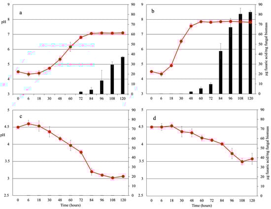 Trend of pH (red line) and fusaric acid concentration (black bars) in the culture supernatants of Fusarium oxysporum f. sp. lycopersici grown in minimal medium supplemented with urea (a), sodium nitrate (b), ammonium sulphate (c) or ammonium nitrate (d) as sole nitrogen sources. Bars represent standard deviations from three independent replicates. Experiments were performed three times, with similar results.