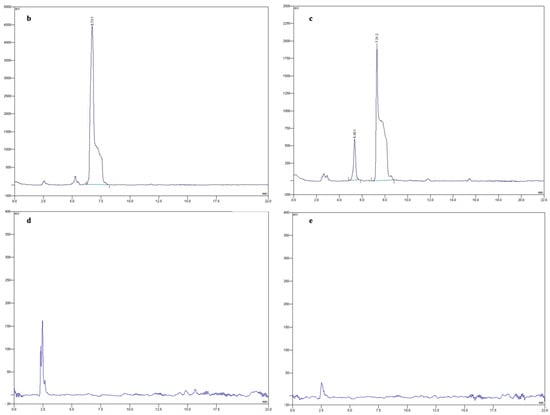 HPLC chromatograms obtained by injecting 20 µg mL−1 of a fusaric acid standard (a) or an ethyl acetate fraction obtained from Fusarium oxysporum f. sp. lycopersici cultures grown in the presence of urea (b), sodium nitrate (c), ammonium sulphate (d) or ammonium nitrate (e) as sole nitrogen sources. The red vertical lines in the graph mark the start and end of each peak.