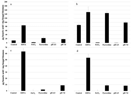 Fusaric acid content in the culture filtrates of F. oxysporum f. sp. lycopersici grown in minimal medium containing urea (a), sodium nitrate (b), ammonium sulphate (c) or ammonium nitrate (d) as sole nitrogen sources and supplemented with 0.2 mM EDTA, 100 µM FeCl3 or 0.2 mM pyoverdine, or pH buffered with 100 mM MES to pH 4.5 or 7. Bars represent standard deviations from three independent replicates. Experiments were performed three times, with similar results.