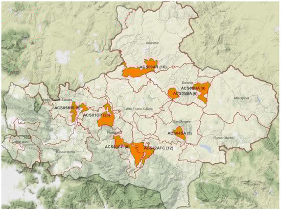 The Campania region is in the southern Italian peninsula, with a total area of 13,595 km2 and a coastline of 350 km (217 mi) bordering the Tyrrhenian Sea. The region has a temperate Mediterranean climate with cold winters and dry summers []. Wild boars occur in 40% of the regional territory (except for Cilento National Park, Vallo di Diano, and Alburni), and Avellino is the province with the highest percentage, followed by Salerno, Caserta, and Benevento (Figure 3). The study was carried out in eight hunting areas distributed throughout the province of Avellino (Table 1).