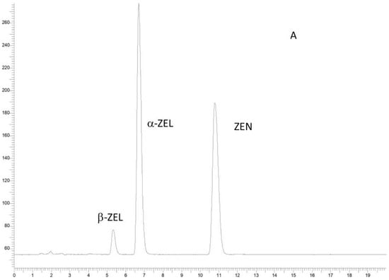 HPLC-FLD chromatograms of: (A) ZEN, α-ZEL and β-ZEL standard solutions (at 100 ng/mL); (B) a liver sample spiked with ZEN, α-ZEL and β-ZEL standard solutions (at 100 ng/mL); (C) a liver sample naturally contaminated with ZEN and α-ZEL; (D) a blank liver sample.
