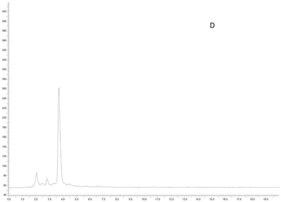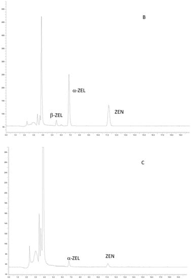 The results of the validation study are reported in Table S1 of the Supplementary Materials. The average recoveries were between 63% and 75% with satisfactory RSD, thus completely fulfilling the performance criteria fixed by the European Commission Regulation (2006) [], i.e., recovery in the range of 50–120% and 70–110% for levels < 1 and between 1 and 10 ng/g, respectively. Figure 2 shows chromatograms of the liver sample of one wild boar naturally contaminated with ZEA and α-ZEL.