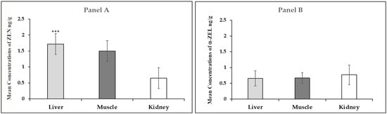 The mean concentrations of ZEN in the liver, muscle, and kidney samples were 1.71 ng/g, 1.49 ng/g, and 0.65 ng/g, respectively; data analysis revealed statistical significance between ZEN concentrations in the liver samples (p < 0.0003) (Table 2; Figure 3, Panel A). The mean α-ZEL values in the liver, muscle, and kidney samples were 0.65 ng/g, 0.66 ng/g, and 0.77 ng/g, respectively (Table 2; Figure 3, panel B). The Kruskal–Wallis test showed no statistical significance between the α-ZEL values in the liver, muscle, and kidney, although the mean α-ZEL values were higher in the kidney samples (Table 2; Figure 3, Panel B).