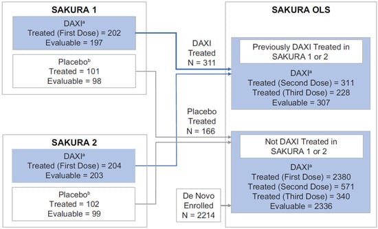 Subject disposition from the three SAKURA trials. a A total of 2786 subjects received at least 1 DAXI treatment (202 subjects received their first DAXI treatment in SAKURA 1, 204 in SAKURA 2, and 2380 in SAKURA 3); of these, 2737 were evaluable subjects with baseline assessment and at least 1 post-baseline antibody assessment. b A total of 2823 subjects were exposed to RTP004 (2786 received RTP004 in the DAXI formulation in the three trials, and 203 received RTP004 in placebo in SAKURA 1 or SAKURA 2); of these, 2772 were evaluable subjects with baseline assessment and at least 1 post-baseline antibody assessment. DAXI, DaxibotulinumtoxinA for Injection.