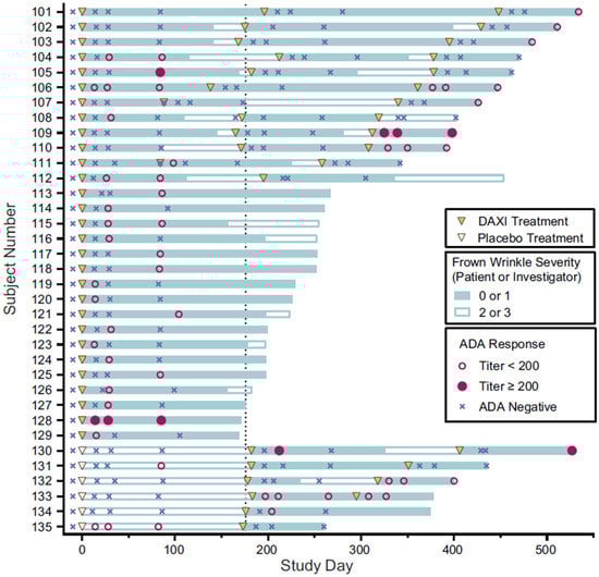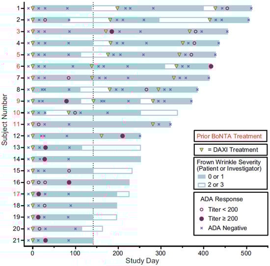 Of the 21 subjects with treatment-related anti-daxibotulinumtoxinA antibodies, seven (33.3%) had previously received BoNTA. Overall, 18 of the 21 subjects (all except Subjects #6, #15, and #16; Figure 2) did not test positive for anti-daxibotulinumtoxinA binding antibodies at their final test visit.