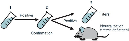Samples confirmed to be positive for the presence of anti-daxibotulinumtoxinA binding antibodies were assessed for the presence of neutralizing antibodies by the validated mouse protection assay [27], whereby serum samples were incubated with daxibotulinumtoxinA (Revance Therapeutics, Nashville, TN, USA) prior to intraperitoneal injection into CD-1 mice (Charles River Laboratories) (Figure 5). Samples were considered to have daxibotulinumtoxinA neutralizing antibodies, if injected mice survived for at least 72 h after the injection. During assay validation, the total purified IgG fraction, derived from a pool of partially purified hyperimmunized rabbit sera containing anti-BoNTA antibodies, was used as a positive control; a concentration of 150 ng IgG fraction per mL of human serum was sufficient to detect daxibotulinumtoxinA-neutralizing activity with this assay. No further testing was conducted on samples confirmed positive for RTP004 as the synthetic peptide has no known intrinsic biological activity.