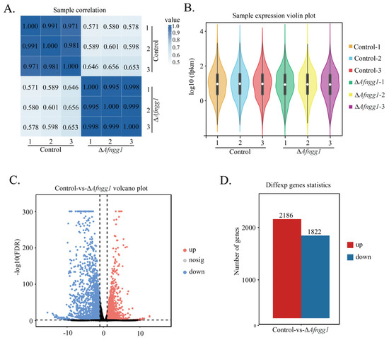 Total RNA was extracted using Trizol reagent (Thermo Fisher, Shanghai, China) following the manufacturer’s instructions. RNA quality and integrity analyses, cDNA library construction, and RNA-Seq were performed by Guangzhou Gene Denovo Biotechnology (Guangzhou, China). The Pearson correlation coefficient was used to analyse the accuracy and reliability of the three biological duplicate samples. DESeq was used to analyse differences in FPKM value, and differences were considered statistically when log2(fold change) >1 and p-value < 0.05 criteria were met. Genome Ontology (GO) functional analysis and Kyoto Encyclopedia of Genes and Genomes (KEGG) pathway analysis were carried out using FungiFun (https://sbi.hki-jena.de/FungiFun/FungiFun.cgi) (accessed on 15 August 2022) and the KEGG Automatic Annotation Sever (http://www.kegg.jp/ or http://www.genome.jp/kegg/) (accessed on 15 August 2022).
