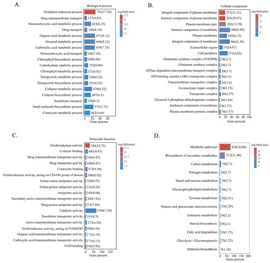 The biological functions of DEGs were characterised by GO functional enrichment analysis. The results showed that most DEGs were linked to oxidation–reduction metabolic processes (Figure 6A). In terms of cellular components, DEGs were mainly associated with the plasma membrane, component of membrane and cell periphery subcategories (Figure 6B). The main molecular functions of DEGs were oxidoreductase activity, binding and catalytic activity (Figure 6C). KEGG pathway enrichment analysis results showed that DEGs were mainly involved in metabolic pathways, biosynthesis of secondary metabolites and aflatoxin biosynthesis (Figure 6D).