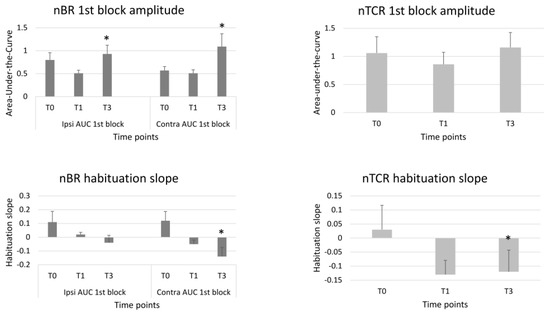 A significant repeated time measurements effect was found for the habituation slope calculated between the 1st and the 2nd block of the contralateral (S = 6.03, p = 0.049), but not of the ipsilateral nBR AUC (S = 1.98, p = 0.151). The between-group analysis revealed that the contralateral habituation slope at the 2nd block was significantly more pronounced at T3 than at T0 (p = 0.049). The repeated time measurements effect was not significant for the nBR AUC habituation slope calculated between the 1st and the 3rd nBR blocks, both for ipsilateral (S = 1.28, p = 0.528) and contralateral (F = 1.19, p = 0.316) responses (Table 2, Figure 1).