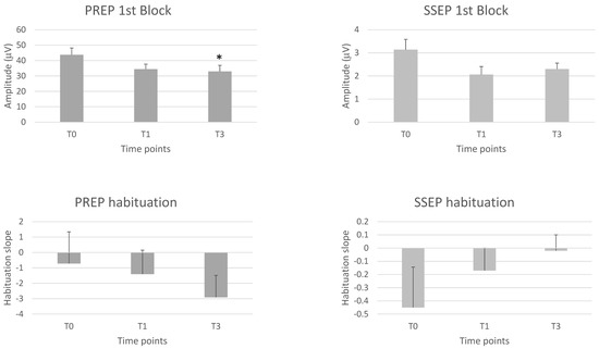 None of the latency and amplitude parameters of the various SSEP components showed a significant repeated time measurements effect, with the same being true for the habituation slope measured at 2nd and 3rd blocks (see Table 5, Figure 2).