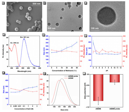 Characterization of AIEMBs and AIEMB probes. (A) SEM image. (B,C) TEM images. (D) Excitation (red line) and emission (blue line) spectra of AIEMBs. (E–G) The effect of methanol, ionic strength, and pH value on the size and photoluminescent intensity stability of AIEMBs (dosage ratio of AIEgens to PMAO = 2:1), which was assessed after 24 h of incubation in the corresponding aqueous solution. (H) DLS results and (I) Zeta-potential of AIEMBs and AIEMB probes. Vertical bars indicate the standard deviation (n = 3).