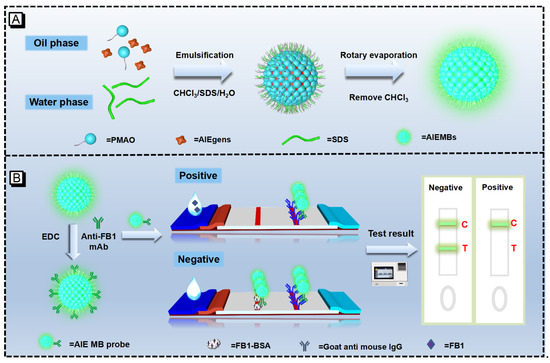 Schematic illustration of the AIE-LFIA for FB1 detection. (A) The synthetic route of the designed AIEMBs. (B) The diagram of AIE-LFIA for FB1 detection.