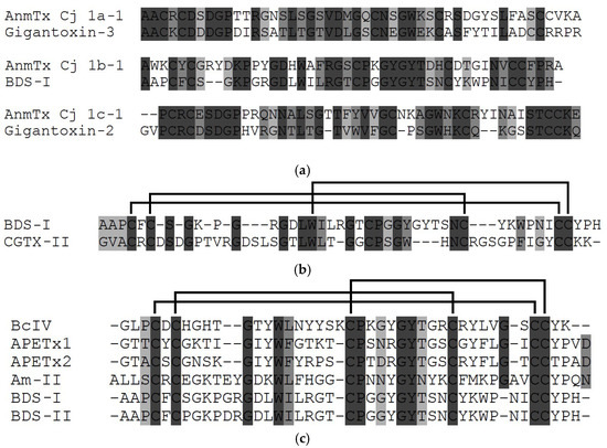 Amino acid sequences of: (a) AnmTX Cj 1a-1, AnmTX Cj 1c-1, AnmTX Cj 1b-1, gigantoxin-3, gigantoxin-2 from S. gigantea [103,139], and BDS-I (UniProt ID: P11494) from A. sulcata [140]; (b) BDS-I and CGTX-II from B. cangicum [106]; and (c) structurally new class of so-called BcIV- and APETx-like peptides [107]: BcIV (UniProt ID: P84919) from B. caissarum [141], APETx1 (P61541) [41] and APETx2 (P61542) [42] from A. elegantissima; Am-II (P69930) from A. maculata [100]; BDS-I and BDS-II (P59084) [142] from A. sulcata. Hydroxy-Pro at position 24 of Am-II is denoted by ‘O’. The sequence similarity is shown as a dark (high) and light (low) gray background, the multiple sequence alignment was performed using the Vector NTI software.