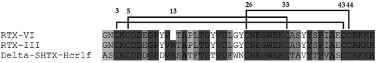 Multiple alignment of the amino acid sequences of type 2 sea anemone NaTxs: RpII (UniProt ID: (P01534) [27], RpIII (P08380) [91] from Heteractis magnifica (Radianthus paumotensis); RTX-I (P30831) [28], RTX-II (P30783) [115], RTX-III (P30832) [29], RTX-IV (P30784), and RTX-V (P30785) [116] from Heteractis crispa (earlier Radianthus macrodactylus); SHTX-IV (B1B5I9) [117] from Stichodactyla haddoni; ShI (P19651) [31,118] from Stichodactyla helianthus; Gigantoxin-3 (Q76CA0) [103] from S. gigantea; Ca I (D2KX90) from C. adhaesivum, Hh X (D2KX91) from H. hemprichii, Ta I (D2KX92) [119] from T. aster. The disulfide bridges are shown above the alignment. The sequence similarity is shown as a dark (high) and light (low) gray background, the multiple sequence alignment was performed using the Vector NTI software.