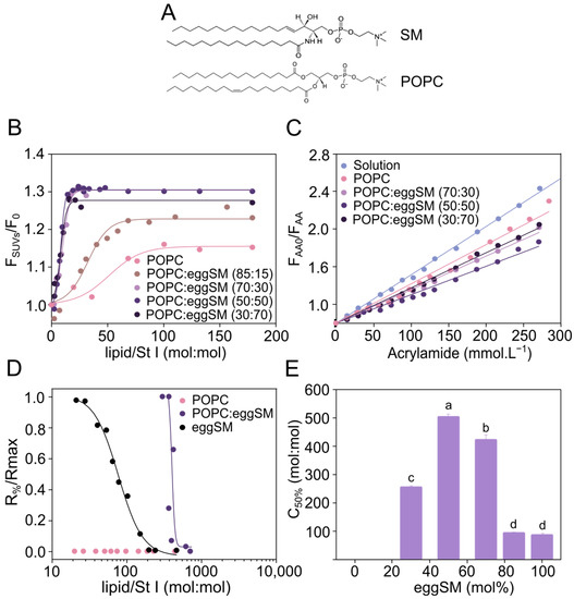 Association and Pore-forming activity of St I in POPC:eggSM vesicles is higher at the equimolar proportion of both phospholipids. (A) Chemical structure of SM and POPC. In the case of SM, the shown structure is the most abundant species in the natural eggSM lipid mixture. (B) Increase in the intrinsic protein fluorescence intensity as a function of the lipid/St I molar ratio. Fluorescence intensities at a given lipid concentration (FSUVs) and in the absence of vesicles (F0) at 332 nm. The figure shows a representative result from three independent experiments. Lines are the best fit of the experimental data to a Boltzmann function (R2 > 0.97). (C) Acrylamide quenching of the intrinsic fluorescence of St I in solution and upon binding to vesicles. Fluorescence intensities were measured in the absence (FAA0) and the presence of acrylamide (FAA) at 332 nm. Lines are plotted according to the Stern–Volmer equation (r2 > 0.98). St I concentration: 1.5 µmol.L−1, λ excitation: 295 nm, and λ emission: 300–450 nm. (D) Increase in CF release from SUVs after 10 min of toxin addition. The maximal release obtained at high toxin doses (Rmax) was slightly different among different vesicle compositions. Therefore, the reported release values (R%) were normalized by dividing by Rmax. Solid lines are the best fit of the experimental data to a Hill function (R > 0.8). (E) Effect of eggSM molar fraction on the vesicles in the permeabilizing activity of St I, expressed as the Lipid/St I molar ratio required to cause lysis of 50% of liposomes in the assay (C50%). The higher the C50% the lower the amount of protein required to permeabilize 50% of the liposomes, reflecting a condition of higher St I activity. Statistical analysis was performed with one-way ANOVA with Tukey as post hoc test. Letters a, b, c, and d indicate independent groups with significant differences among them (p < 0.05).