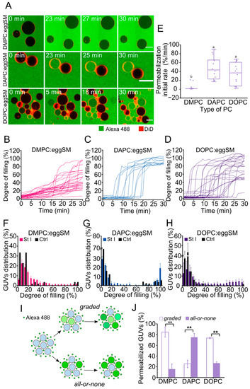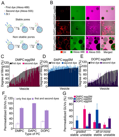 The all-or-none mechanism has been associated with the formation of stable pores characterized by a sufficiently long lifetime that allows equilibration between the intra- and extravesicular content. In the graded mechanism the pores are supposed to be transient, which does not allow the equilibration of contents [18,19,20]. To investigate whether membrane fluidity impacts the stability of membrane pores formed by St I at equilibrium, we added Alexa 555 after 1-h incubation with Alexa 488, and measured GUVs permeability to both dyes (Figure 4A).