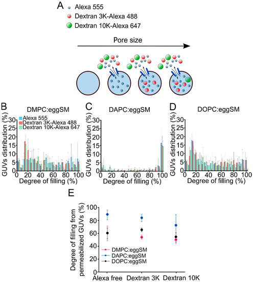 A variety of approaches have been used to estimate the pore size of actinoporins by using osmoprotectans of disparate sizes [21,22] and fluorescent dyes [22], or even X-ray crystallography [4] revealing pore radius ranging from 0.6–1.2 nm. To investigate whether the size of the pore formed by St I is related to membrane fluidity, in this work we assessed the permeability of the vesicles to solutes of different sizes. For this, we determined the permeability of the GUVs to free Alexa 555, 3 kDa Dextran-Alexa 488 or 10 kDa Dextran-Alexa 647 upon treatment with St I for 30 min by confocal microscopy (Figure 5A). Approximate hydrodynamic radii for Alexa 555, 3 kDa Dextran Alexa 488, and 10 kDa Dextran 647Alexa were estimated to be: 0.86 nm, 1.4 nm, and 2.4 nm, respectively. As expected, St I followed a graded mechanism of permeabilization in vesicles containing DMPC or DOPC characterized by high fluidity and an all-or-none mechanism in vesicles of low fluidity (DAPC), without relevant differences between the size markers (Figure 5B–D). From the histograms we calculated the mean degree of filling of the permeabilized vesicles (filling degree above 20%) for each fluorescent marker. This analysis revealed that the vesicles containing DAPC were more permeable to the three solutes in comparison with vesicles containing DMPC or DOPC, which were similar between them (Figure 5E). This result suggests that the pores formed by St I are tunable in size and can be modulated by membrane fluidity. Therefore, in vesicles of high fluidity, St I forms pores of lower size than in low fluidity membranes.