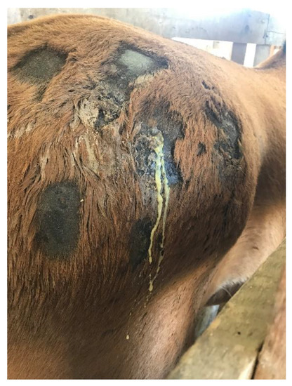 All horses presented satisfactory clinical conditions because no significant clinical alterations were diagnosed. Some horses from the CG, mainly colts and fillies, required a twitch to ensure the handler’s safety. This restraining method might explain why horses from the CG, despite their lack of statistical significance, presented higher heart rates (HR) (56.0 ± 3.80 bpm) than those from the IG (45.9 ± 5.81 bpm). Multiple subcutaneous abscesses (Figure 1) and bilateral thrombophlebitis were observed in the IG horses but not in the controls. Furthermore, all horses from the IG presented with lymphadenopathy. Mandibular, parotid, retropharyngeal, superficial cervical, and ischiatic lymph nodes were palpable, with increased temperature and slight sensibility. No horse from the CG presented any lymph node enlargement.
