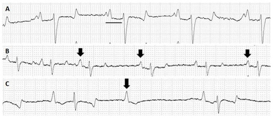 ECG records from horses who had undergone from six to eight immunization cycles for Loxosceles antivenom production. (A) First-degree AV block. Note the increased PR interval (0.35 s) (black line). (B) Wandering atrial pacemaker. Notice the different P-wave morphology (arrows). (C) Second-degree AV block. Note that a P wave is not followed by a QRS complex (arrow) despite the maintenance of PP intervals. Recordings of the second deviation of the frontal plane (DII), with a velocity of 25 mm/s and amplitude 1 N.