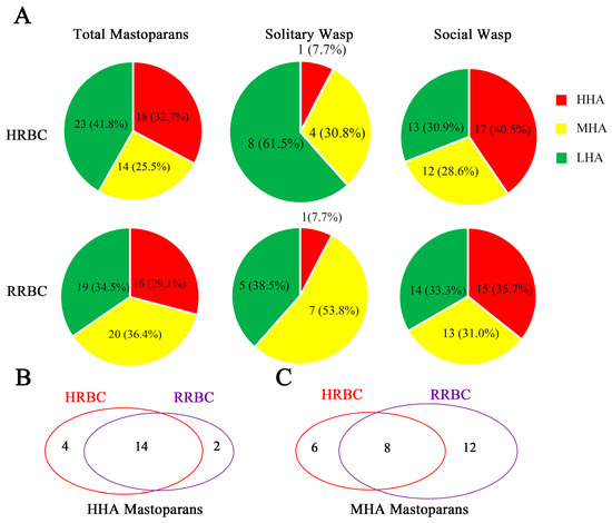 The hemolytic characteristic patterns of 55 mastoparans according to wasp lifestyles in HRBCs and RRBCs. (A) Pie chart analysis of the proportions of HHA, MHA and LHA among 55 mastoparans, divided into solitary wasps and social wasps. (B,C) Venn diagram analysis of the difference between HHA mastoparans (B) and MHA mastoparans (C) on HRBCs and RRBCs.