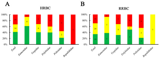 Characterization of the hemolytic activity of 55 mastoparans on wasp species. (A,B) Statistical analysis of the proportion and number of 55 mastoparans from different wasp families on HRBCs (A) and RRBCs (B). The red color means HHA mastoparans, yellow color means MHA mastoparans and green color means LHA mastoparans.