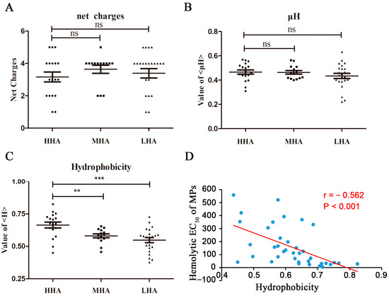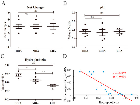 Structure–activity relationship analyses of the hemolytic effects of Protopolybia-MPIII and Protopolybia-MPI on HRBCs. The effect of net charges (A), amphipathicity (B) and hydrophobicity (C) of 14 mutations of Protopolybia-MPIII (5 HHA mutants, 5 MHA mutants and 4 LHA mutants) on hemolytic activity; ns: no significance, * indicates a p value < 0.05, ** indicates a p value < 0.01, and *** indicates a p value < 0.001. (D) The relationship between the hemolytic EC50 and hydrophobicity of 14 mutated peptides.