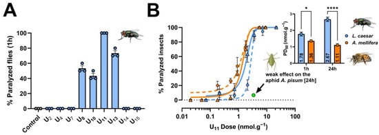 At the doses tested, four peptides (U8, U10, U11, and U13) paralyzed flies 1 h after injection, of which only U11 caused paralysis of all flies (ten flies per replicate) in all three replicates, yet at the lowest dose tested among the peptides (i.e., 27 nmol. g−1; doses are normalized to the average body weight of the injected prey for further comparison among different insect species) (Figure 1A). Based on this result, we selected U11 for further investigation and determined its potency to paralyze flies 1 h and 24 h after injection. These experiments confirmed that U11 is a potent neurotoxic peptide capable of inducing rapid flaccid paralysis in flies with a PD50 value of 1.78 ± 0.12 nmol. g−1 1 h post injection. The paralysis was irreversible 24 h post injection with a PD50 value of 2.67 ± 0.13 nmol. g−1 (Figure 1B). We then extended our experiments by injecting U11 into honeybees (Apis mellifera) and aphids (Acyrthosiphon pisum) to evaluate whether the peptide was active against beneficial and pest insects. U11 was significantly more capable of paralyzing honeybees than blowflies 1 h post injection (the PD50 value was 1.36 ± 0.08 nmol. g−1) and 24 h post injection (PD50 value was 1.11 ± 0.09 nmol. g−1) (Figure 1B). In contrast, U11 had only a weak effect when injected into A. pisum at a dose of 3.4 nmol. g−1 (6.6% of aphids were affected 24 h post injection) (Figure 1B) and on aphid fitness when monitored over 7 days (Figure S1).