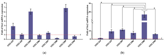 To evaluate the Stx expression at the transcription level, all ten of the STEC strains were induced using mitomycin C. Among the eight Stx1-producing strains, four of them (STEC435, STEC1585, STEC1587, and STEC1589) showed a higher level of Stx1 mRNA transcription after induction (Figure 2a). The Stx2 mRNA transcription of the six Stx2-producing strains increased after induction (Figure 2b). Notably, strain STEC1588, producing Stx2a, showed higher inducibility than the other Stx2 subtype strains (p-value ≤ 0.05).