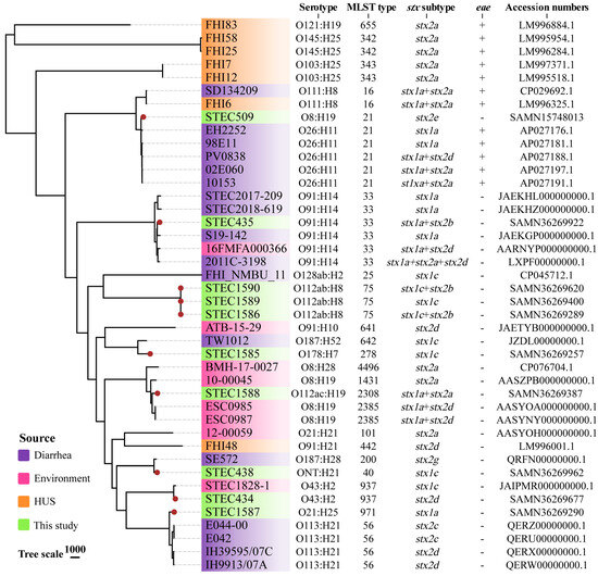 Phylogenetic tree based on core-genome single-nucleotide polymorphisms (SNPs) using the maximum likelihood method. The source, serotype, MLST type, stx subtype, eae, and accession numbers of all strains are shown. The red circles represent the strains isolated from this study.