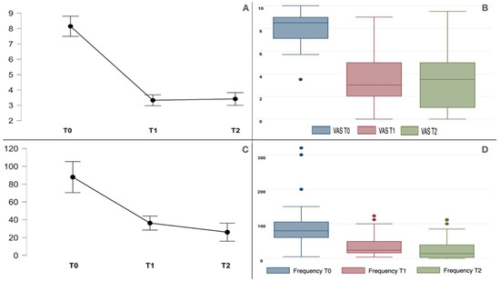 (A,B) The plot line (with standard error bars) and the boxplot for VAS of all the TN patients studied at the baseline (T0) and at 1-month (T1) and 3-month (T2) evaluations. There was a significant improvement in pain intensity throughout the follow-ups (F1.2,48.8 = 128.2, p < 0.001). (C,D) The plot line (with standard error bars) and the boxplot for paroxysm frequency (number per week) of all the TN patients studied at the baseline (T0) and at 1-month (T1) and 3-month (T2) evaluations; this variable improved significantly (F1.0,40.4 = 28.9, p < 0.001). The boxplots are represented by the median, the interquartile range, and the minimum and maximum scores (whiskers); the dots represent the outliers.