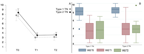 (A,B) The plot line (with standard error bars) and the boxplot for VAS of type 1 and type 2 TN patients studied at the baseline (T0) and at 1-month (T1) and 3-month (T2) evaluations. Repeated measures ANOVA was statistically significant (F1.2,47.5 = 123.4, p < 0.001). The boxplots are represented by the median, the interquartile range, and the minimum and maximum scores (whiskers); the dots represent the outliers.