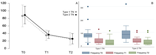 (A,B) The plot line (with standard error bars) and the boxplot for paroxysm frequency (number per week) of type 1 and type 2 TN patients studied at the baseline (T0) and at 1-month (T1) and 3-month (T2) evaluations. There was a significant reduction in frequency in both groups (F1.0,39.4 = 27.8, p < 0.001). The boxplots are represented by the median, the interquartile range, and the minimum and maximum scores (whiskers); the dots represent the outliers.