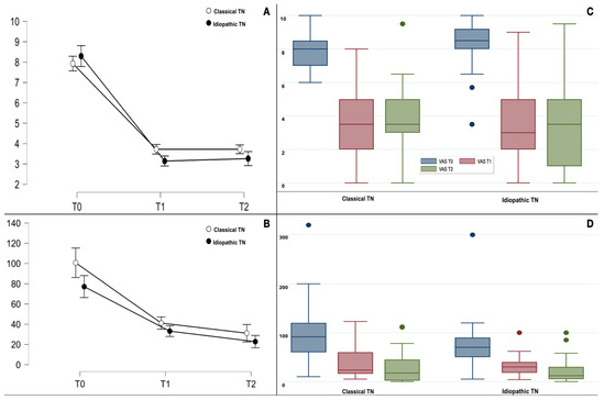 (A,C) The plot line (with standard error bars) and the boxplot for paroxysm pain (VAS) in classical and idiopathic TN at the baseline (T0) and at 1-month (T1) and 3-month (T2) evaluations. (B,D) The plot line (with standard error bars) and the boxplot for paroxysm frequency (number per week) at the baseline (T0) and at 1-month (T1) and 3-month (T2) evaluations. The boxplots are represented by the median, the interquartile range, and the minimum and maximum scores (whiskers); the dots represent the outliers.