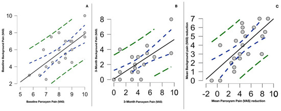 (A) Scatter plot of the significant correlation between baseline paroxysm pain intensity and baseline background pain intensity of type 2 TN patients. Analysis was performed with Spearman’s correlation test (r 0.8, p < 0.001). (B) The same correlation remained statistically significant at 3-month evaluation (r 0.7, 0.4–0.9, p < 0.001). (C) Scatter plot significantly correlating the mean reductions in paroxysm pain and background pain (r 0.7, 0.4–0.9; p < 0.001). The dotted blue curve represents the 95% confidence interval, while the green dotted curve represents the 95% prediction interval.