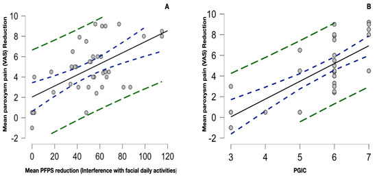 (A) Scatter plot of the significant correlation between the mean paroxysm pain reduction and the mean PFPS score reduction (interference with daily facial activities only); r 0.6, 0.3–0.8, p < 0.001. (B) Significant correlation between the PGIC and the mean paroxysm pain reduction; r 0.7, 0.5–0.8, p < 0.001. The dotted blue curve represents the 95% confidence interval, while the green dotted curve represents the 95% prediction interval.
